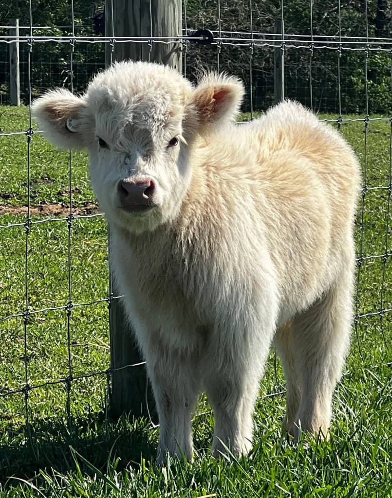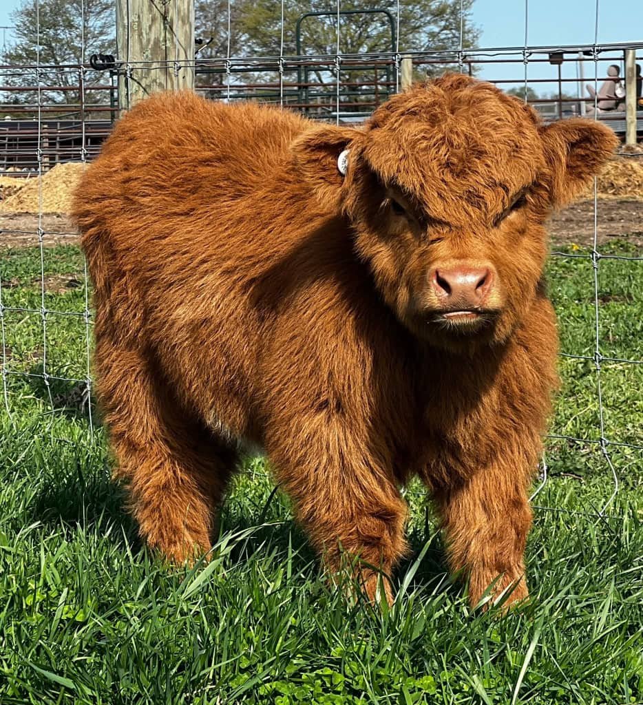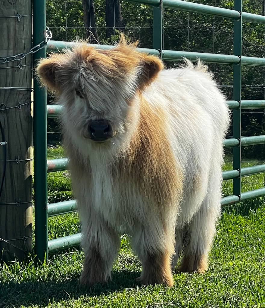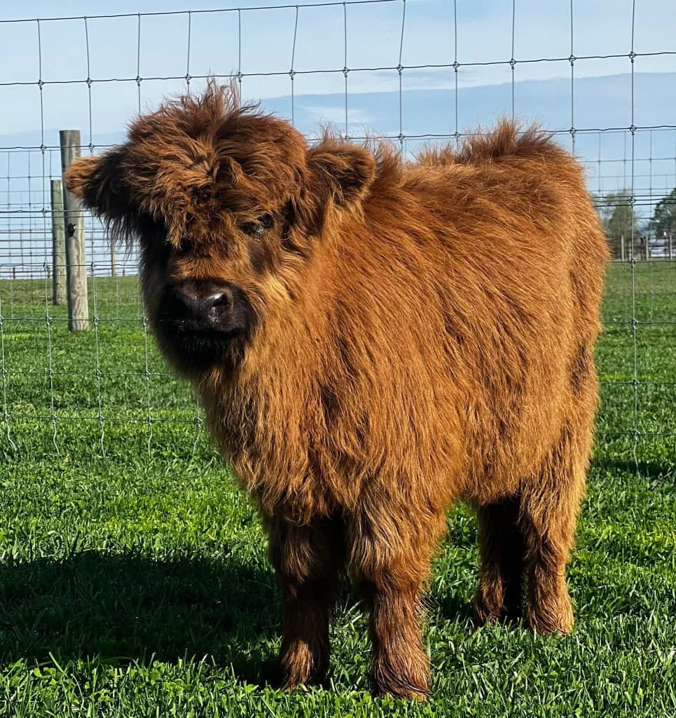This adorable dark brown mini Highland calf is known for his calm presence and loyal nature. He’ll make a wonderful addition to any farm.