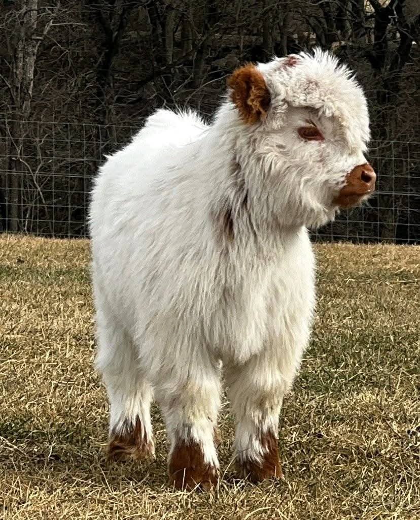 Rusty is a fluffy, white mini Highland calf with a very calm and gentle demeanor. He’s perfect for first-time calf owners.